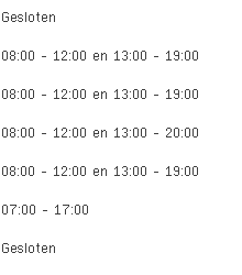 Chantal Lapere aan de G. Gezellestraat 2 in Staden is vandaag geopend van 08:00 tot 12:00 en vervolgens van 13:00 tot 19:00.