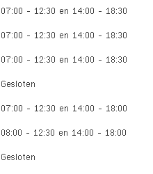 Slagerij Hans en Stefanie aan de Peperstraat 5 in Gullegem is vandaag geopend van 07:00 tot 12:30 en vervolgens van 14:00 tot 18:30.