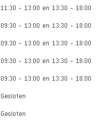 Toussaint aan de Rue Van Opré 11 in Jambes is vandaag geopend van 09:30 tot 13:00 en vervolgens van 13:30 tot 18:00.